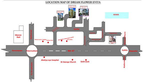 Dreamflower Evita is located just 1.2 km from NH 47 Bye pass Opp. Gold Souk Mall, Vytilla, Cochin.